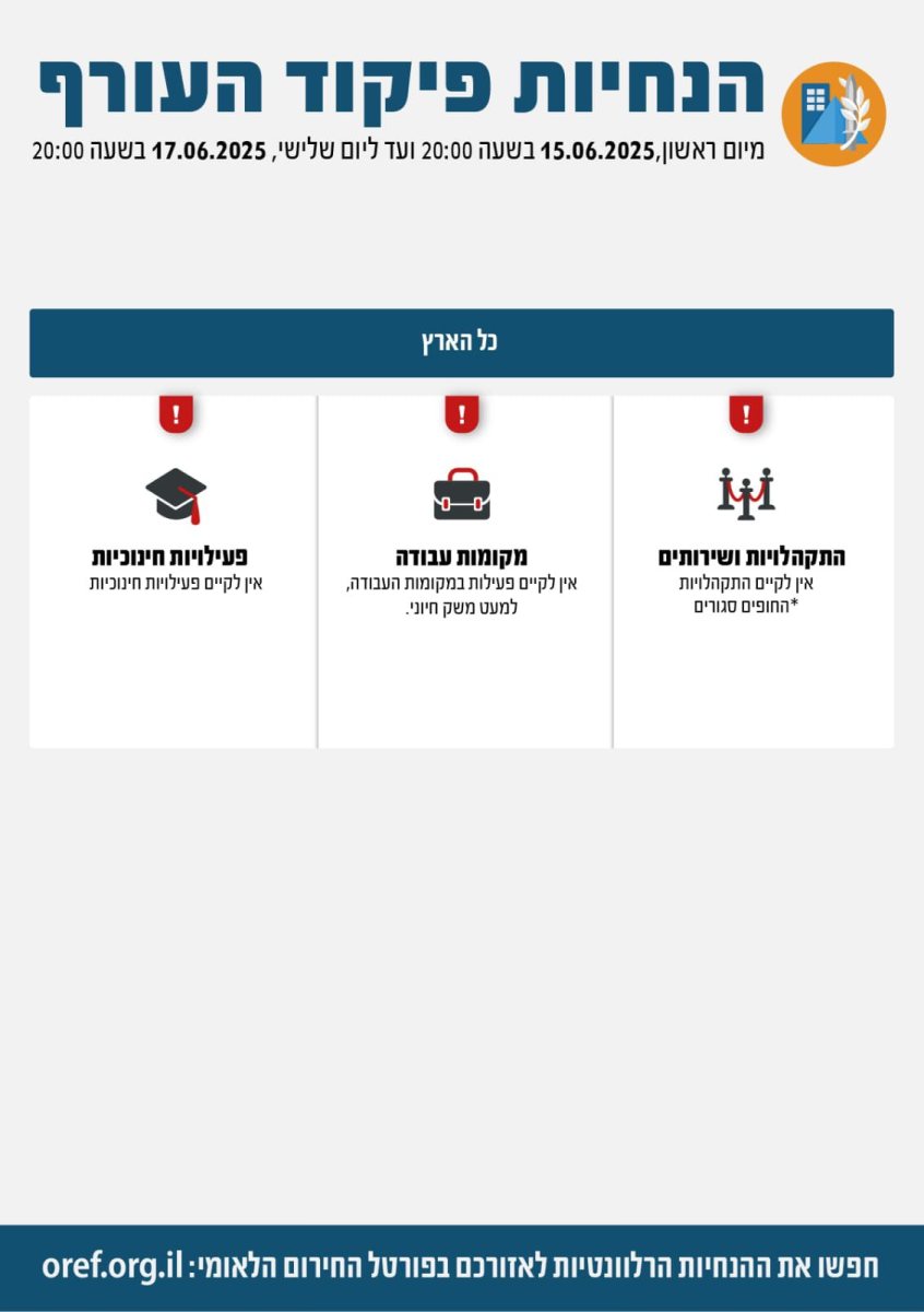 הנחיות פיקוד העורף ליום שני 16/06/2025