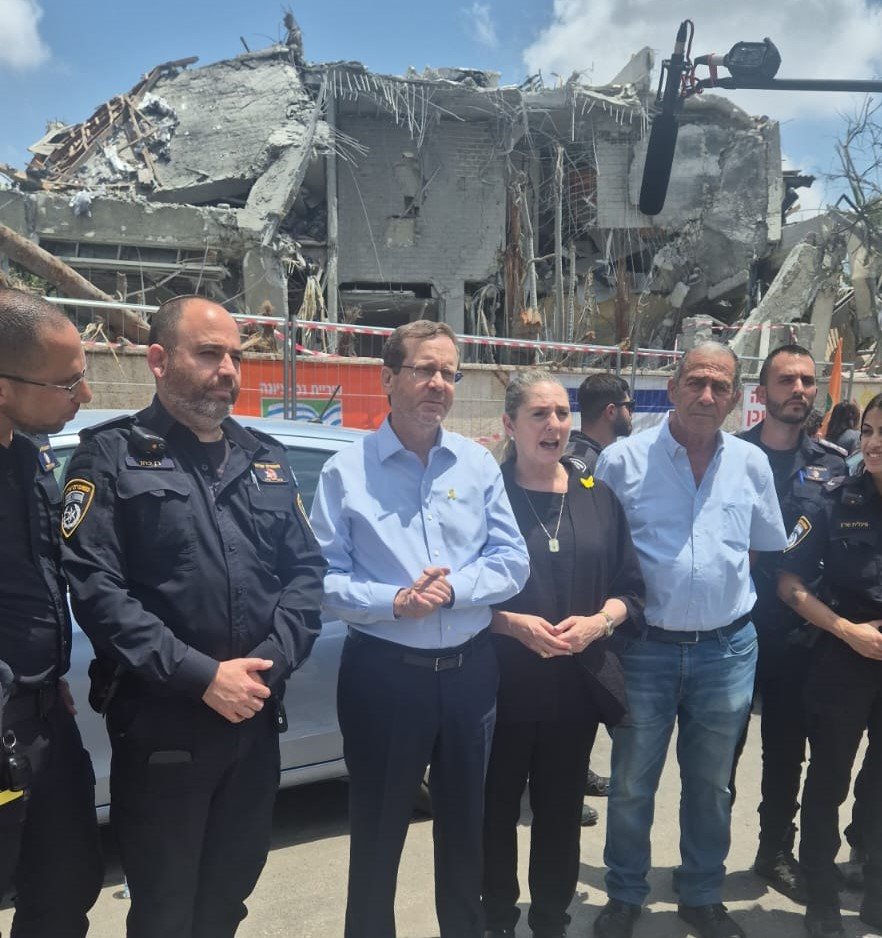 נשיא המדינה יצחק הרצוג ורעייתו מיכל, הגיעו הבוקר לחזק את תושבי נס ציונה – וביקרו באזור נפילת הטיל בשכונת מליבו בעיר.