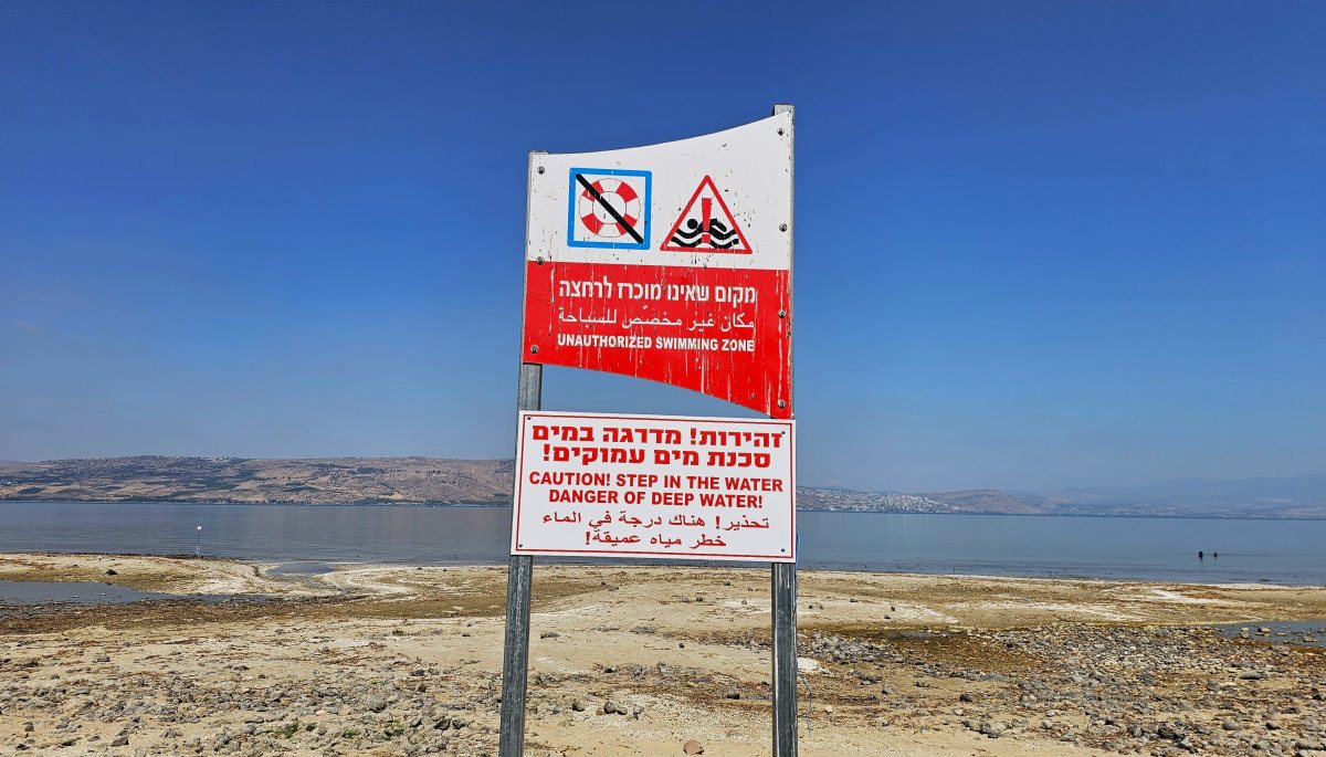 רוחצים בכנרת קיץ 2025 - שלטי אזהרה מפני מדרגות העומק. עקב מפלס הכינרת הנמוך נערכה בדיקה של "המדרגה" התת ימית בקרקעית הכינרת שלטי אזהרה הוצבו מול חוף שיזף רותם