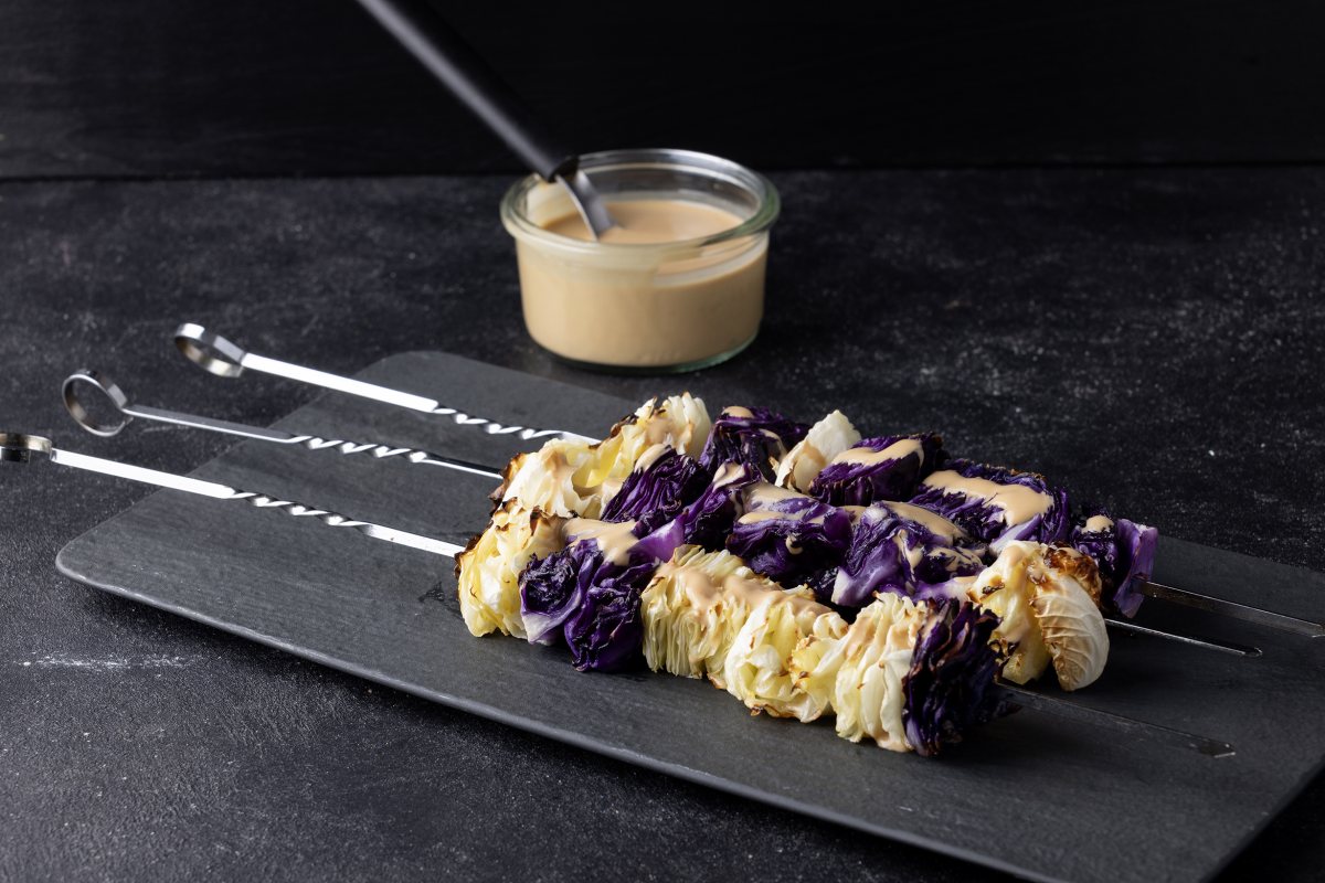 - מניחים את שיפודי הכרוב על צלחת הגשה, מזלפים מעל רוטב טחינה ומגישים.
