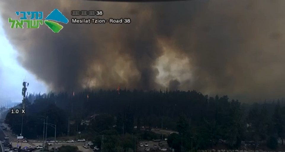 "לפיד אדום". שריפת הענק בהרי ירושלים אילצה את פינוי היישוב מסילת ציון, כאשר הלהבות הגיעו עד לקו הבתים. עדי ראייה מדווחים כי האש מתנשאת לגובה של כ-30 מטר ויוצרת מחזה מבעית ומסוכן.